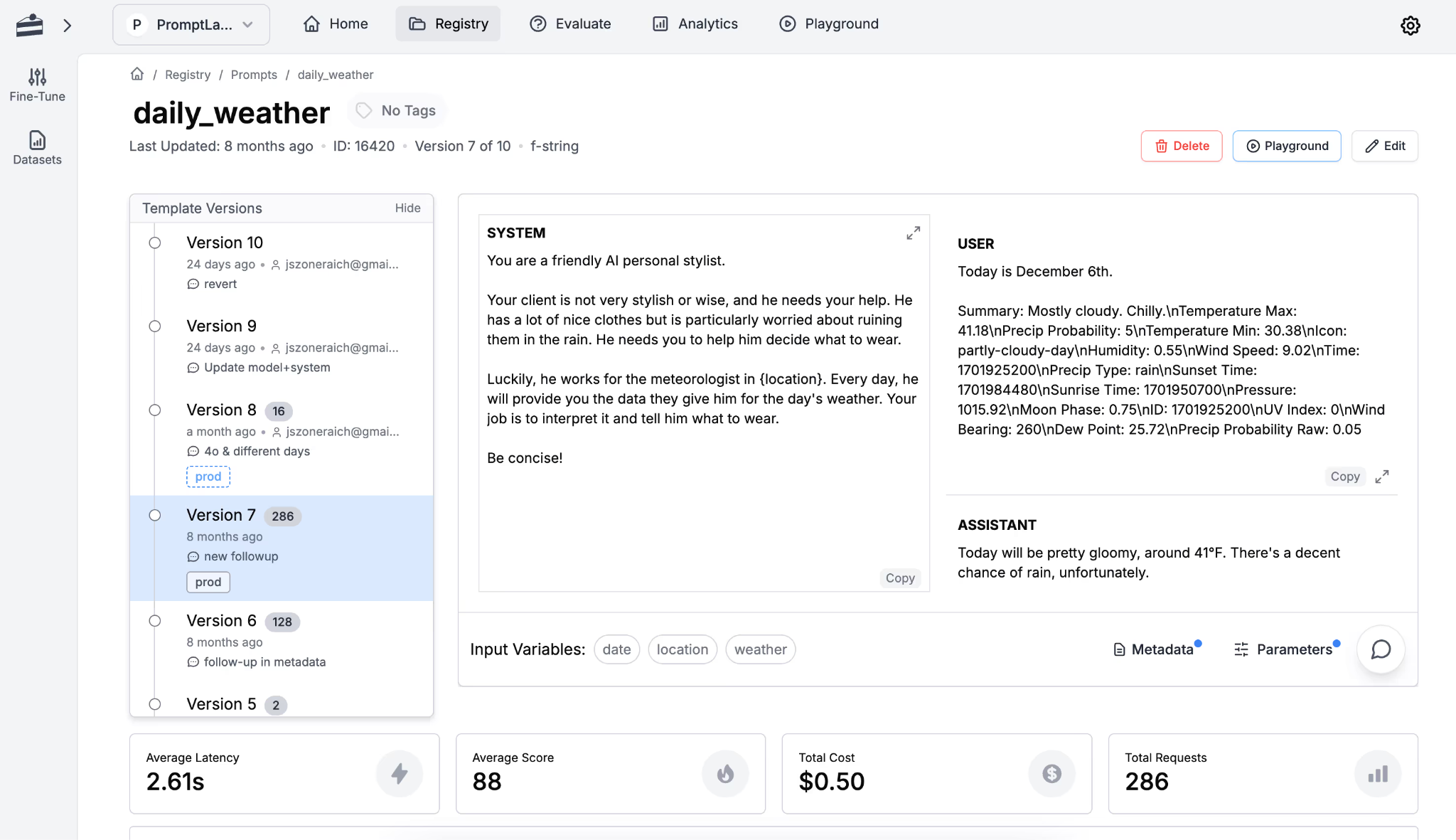 - Version control and history: Every prompt change is saved with a unique identifier. Teams can compare versions, see what changed, and revert to previous versions when needed.
