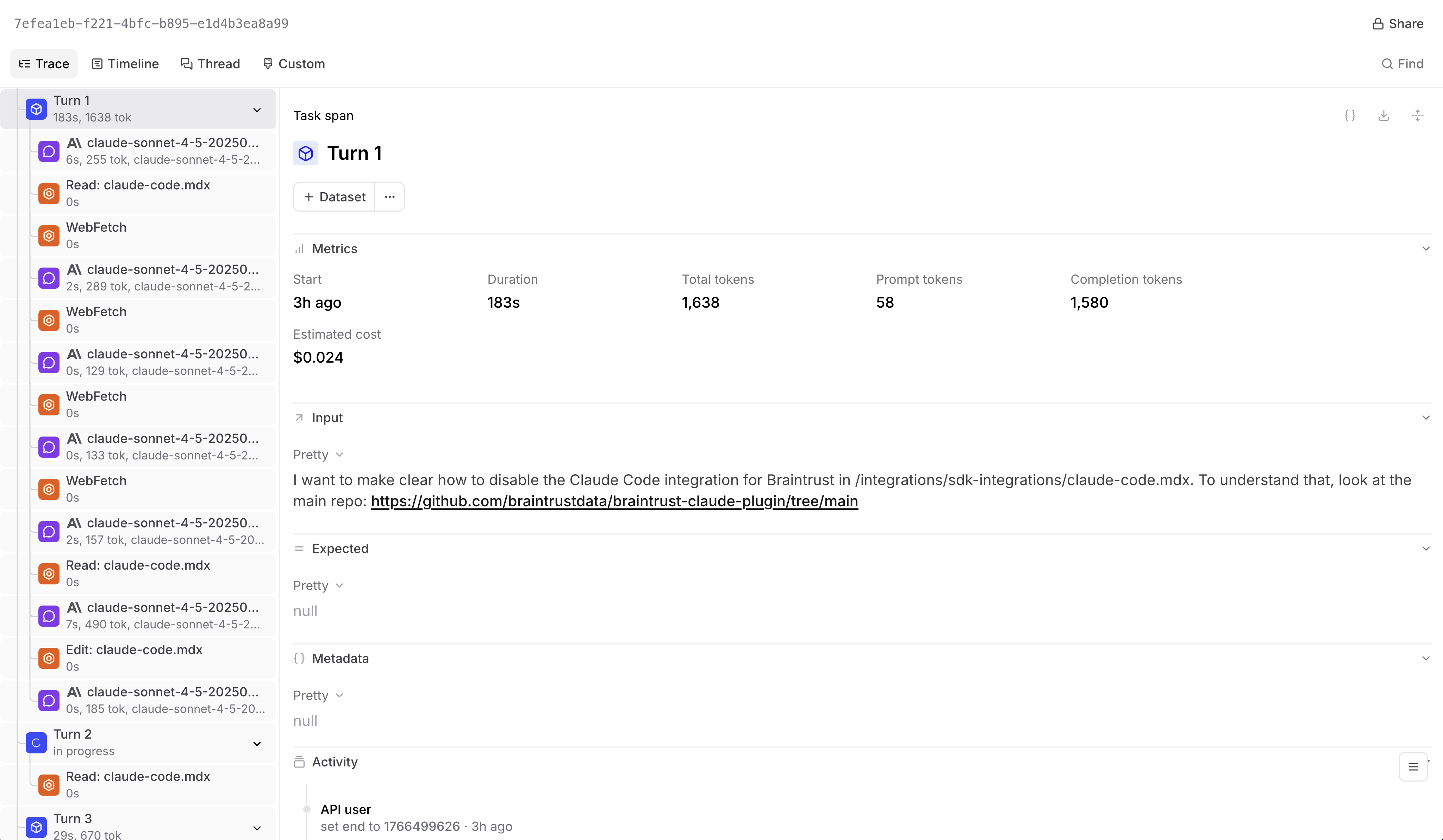 Once the plugins are installed and an API key is added, trace capture starts automatically. When you need production data or experiment results, Claude Code can fetch them on demand. The same Braintrust infrastructure teams use to run production AI now operates directly inside the development loop.