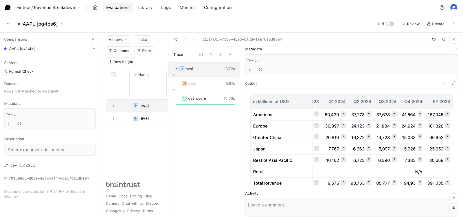They don’t just check that sources are included. They also make sure they’re valid, properly formatted, and tied directly to the insights. The team set up custom rules in Braintrust, like requiring SEC IDs and double-checking quoted text, and real-time monitoring catches anything that doesn’t meet the standards.